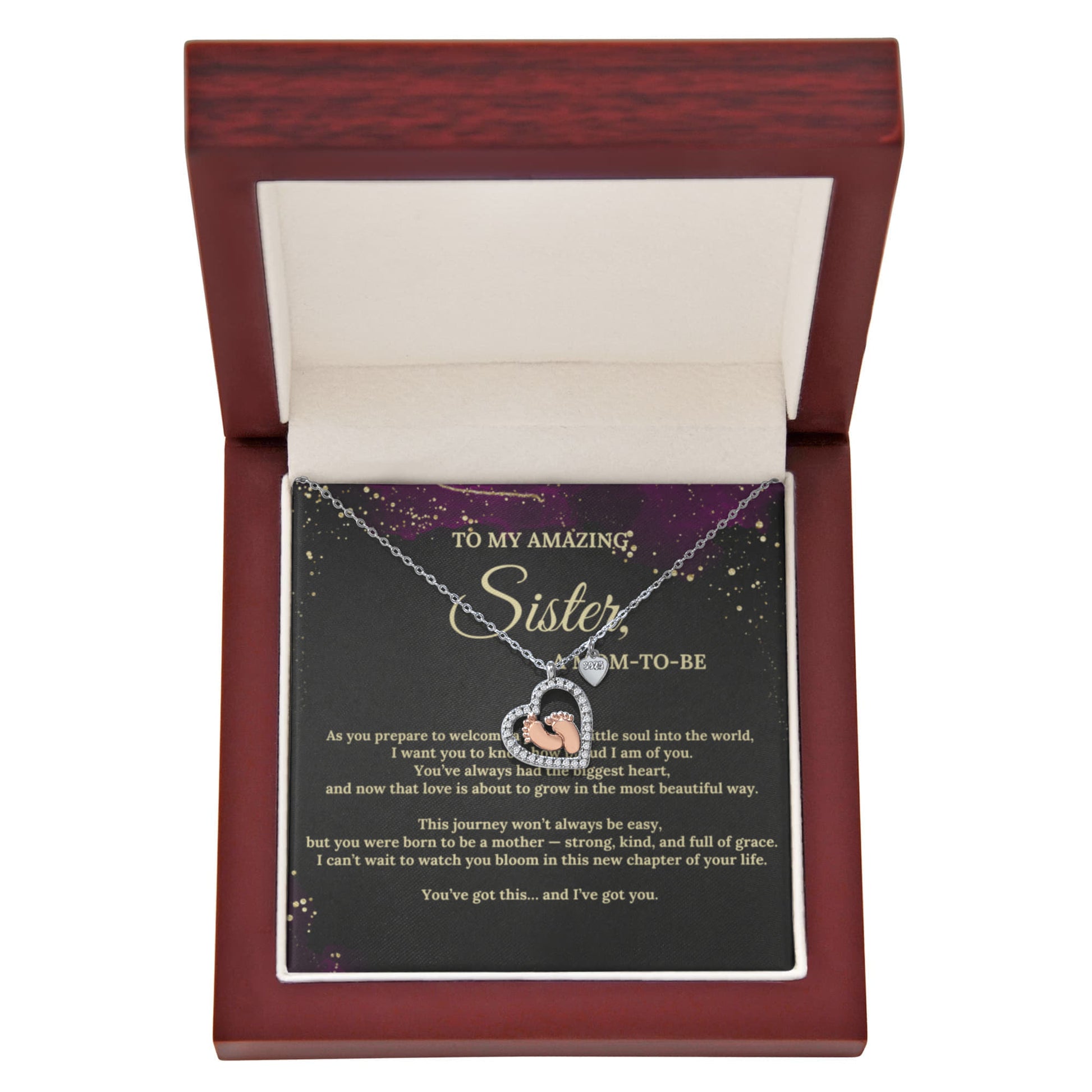 Celebrate the beautiful journey into motherhood with the Baby Feet Heart Necklace — a heartfelt gift for your sister as she prepares to welcome the newest love of her life.